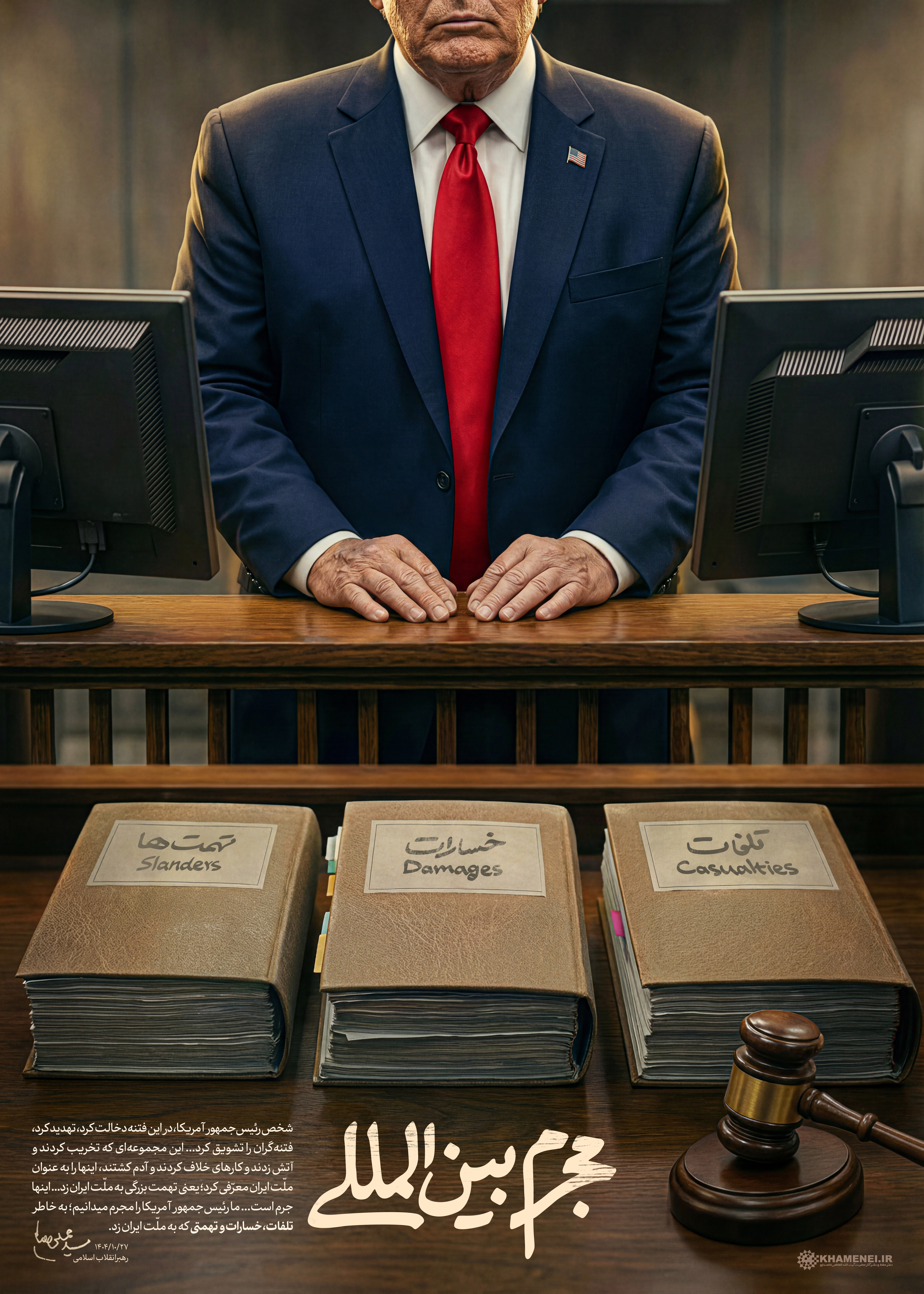 حضرت آیتالله خامنهای: شخص رئیسجمهور آمریکا، در این فتنه دخالت کرد، تهدید کرد، فتنهگران را تشویق کرد… این مجموعهای که تخریب کردند و آتش زدند و کارهای خلاف کردند و آدم کشتند، اینها را به عنوان ملّت ایران معرّفی کرد؛ یعنی تهمت بزرگی به ملّت ایران زد؛… اینها جرم است… ما رئیسجمهور آمریکا را مجرم میدانیم؛ به خاطر تلفات، خسارات و تهمتی که به ملّت ایران زد. ۱۴۰۴/۱۰/۲۷